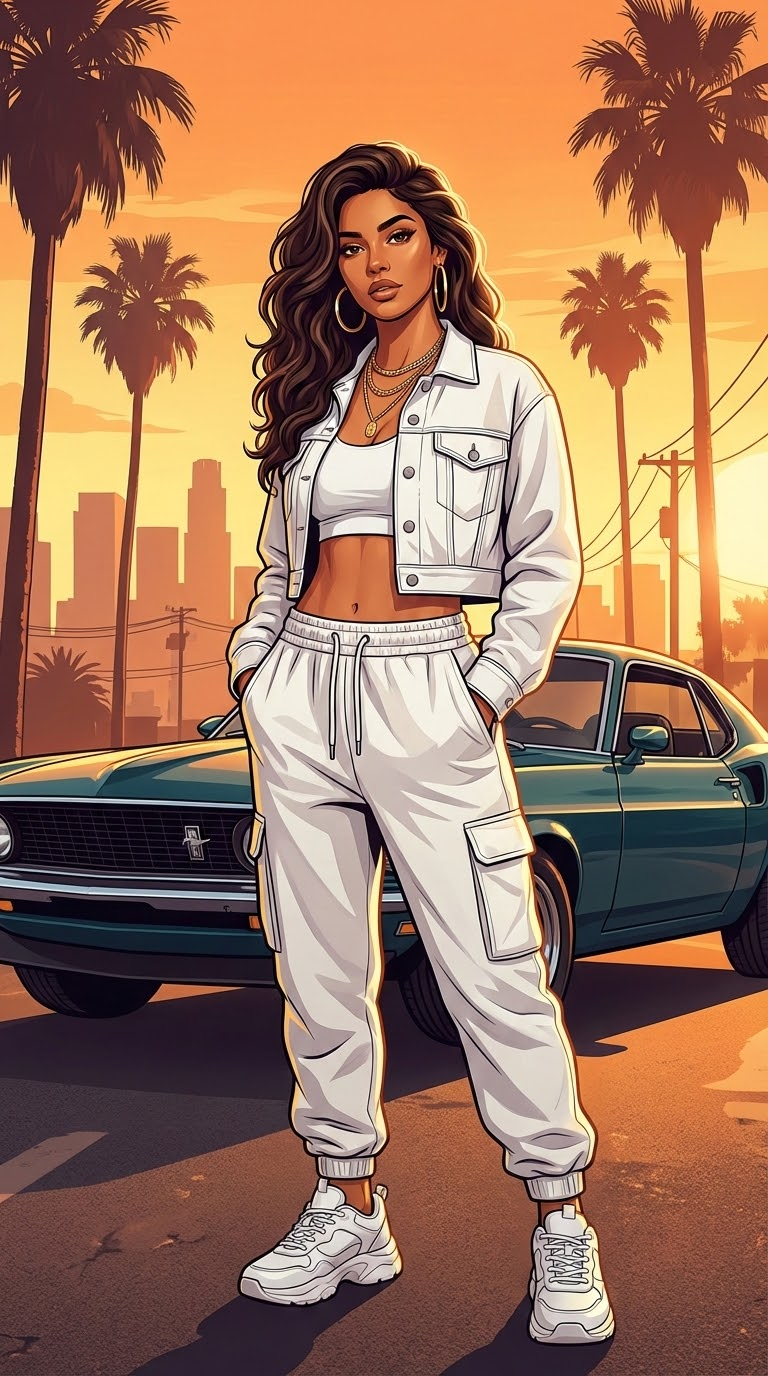 NANO BANANA PROОбраз для промпта: стильная молодая женщина в городском уличном стиле с руками в карманах, белым топом и кроссовками, крупными золотыми серьгами и слоистыми ожерельями. Фон в GTA-стиле с тёплым закатным светом.