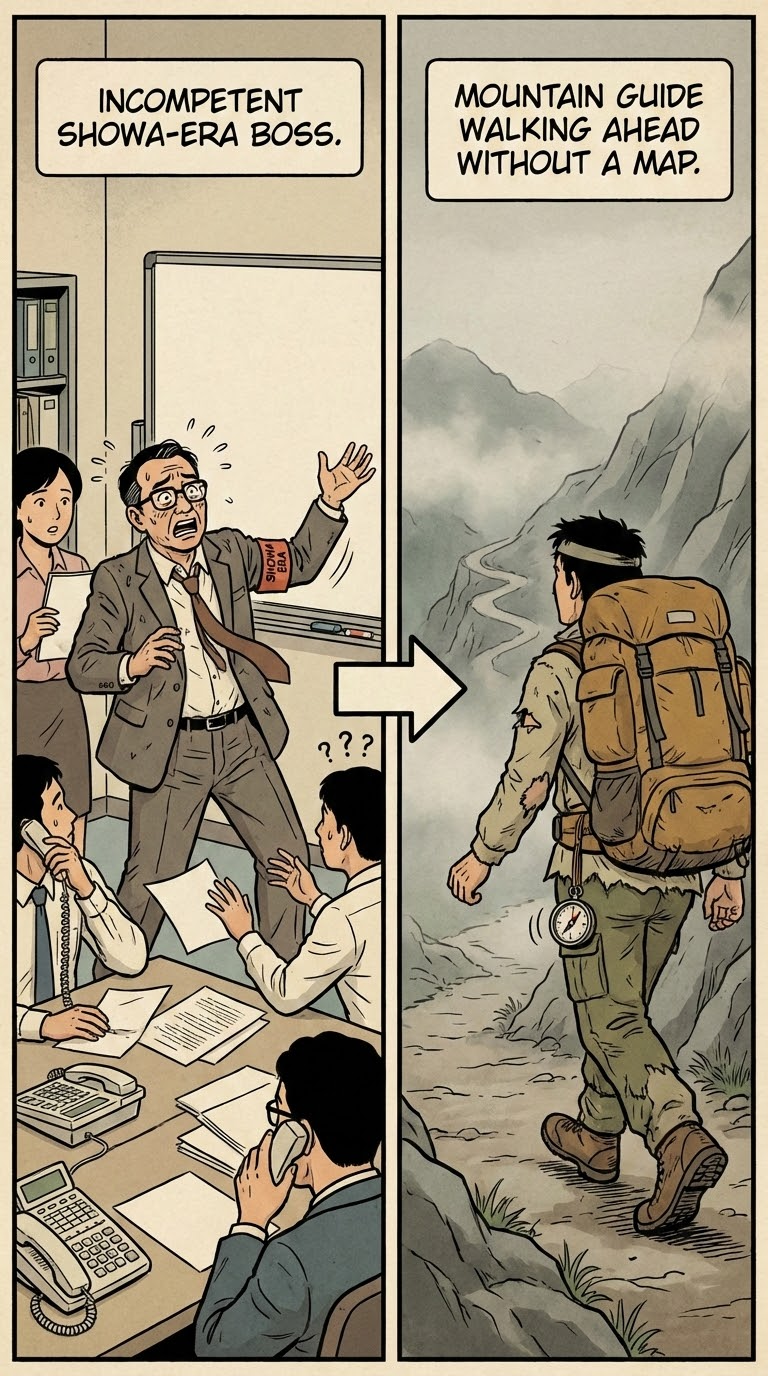 NANO BANANA PROИллюстрация сравнивает неумелого босса эпохи с горой без маршрута. Это юмористическая сцена, подчеркивающая абсурдность управления и сатиру на начальство.