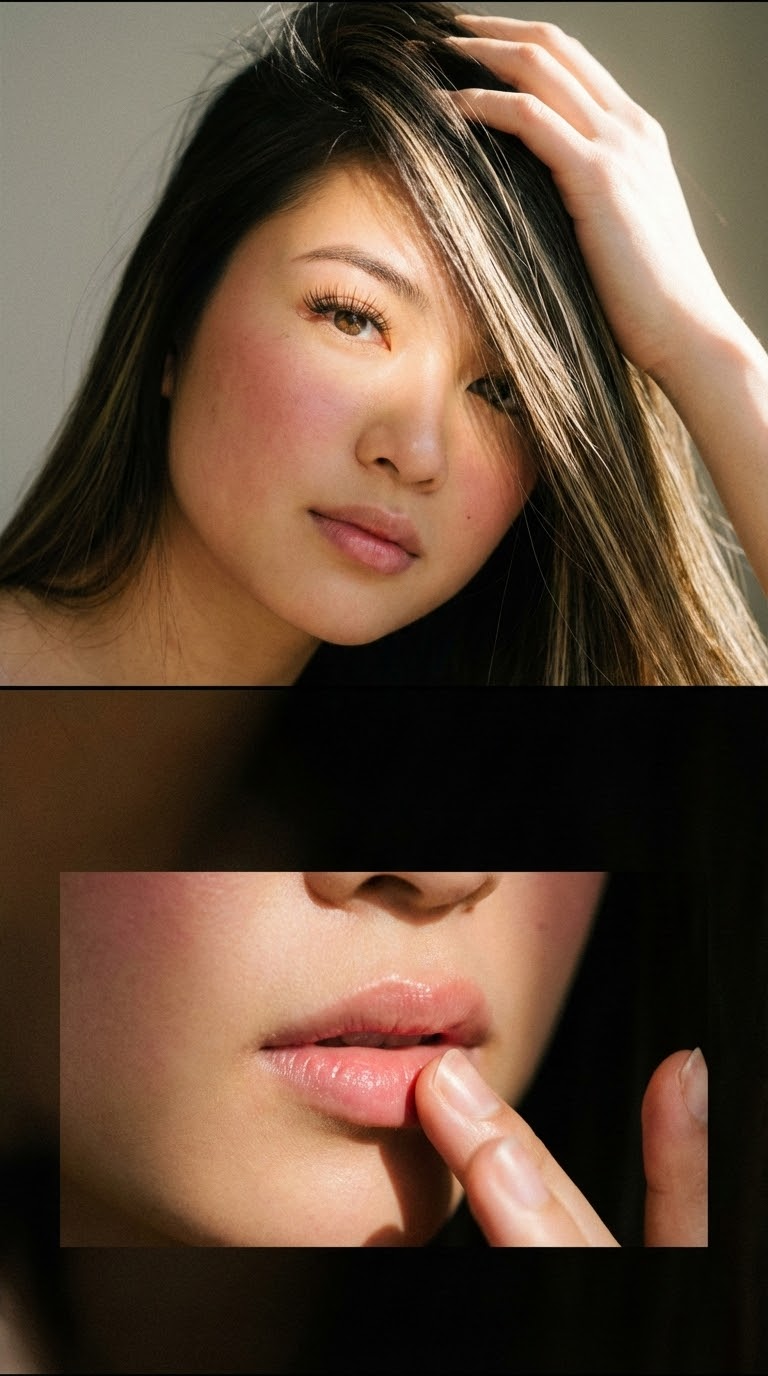 NANO BANANA PROДвухчастный промпт о женщине на фото. Первый кадр — крупный план глаз, второй — губы в кадре. Мягкий свет и зернистость подчеркивают текстуру кожи.