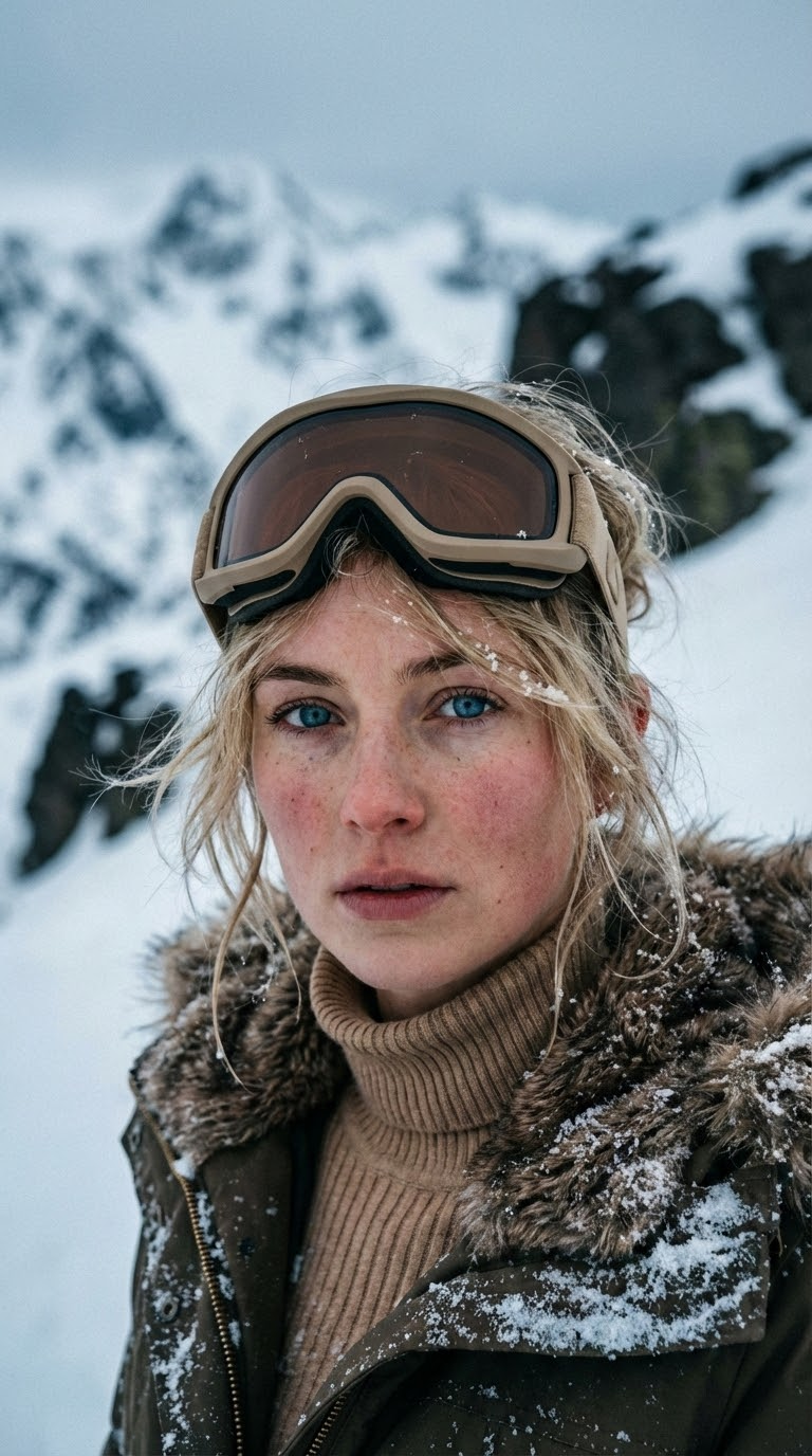 NANO BANANA PROЭлегантный кадр зимнего портрета женщины в вязаном воротнике на альпийском фоне. Яркие голубые глаза и холодная снежная атмосфера создают выразительный сюжет кадра.