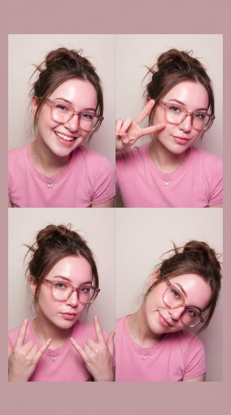 NANO BANANA PRO4-панель коллаж в реалистичном портрете молодой женщины. Фокус на прямой взгляд в камеру и мягкий макияж, подчёркнутые розовые очки и сияющая кожа создают стильный образ.