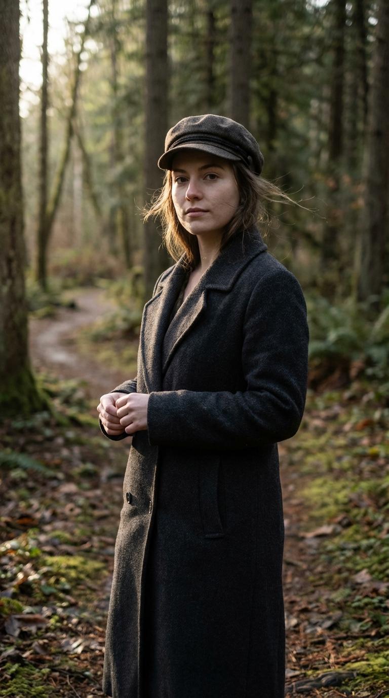 NANO BANANA PROРеалистичный портрет женщины в лесу полного роста в длинном темном пальто. Низкий ракурс и мягкий дневной свет создают спокойную уверенность и выразительный образ.