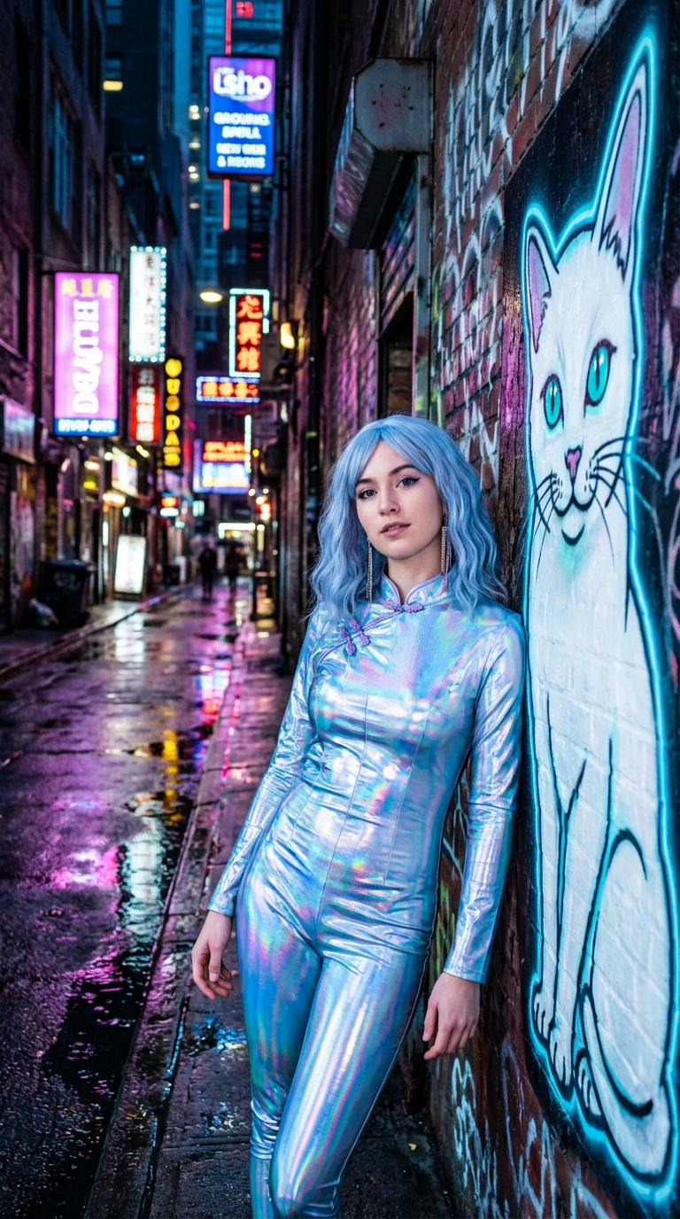 NANO BANANA PROЖенщина в киберпанке стоит в мокром переулке под неоновыми вывесками, демонстрируя уверенность и холодную элегантность. Образ сочетает голографический костюм и неоновую подсветку, создавая стильную футуристическую сцену.
