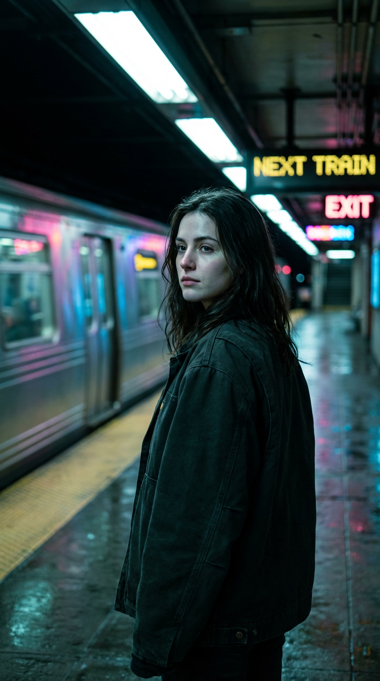 NANO BANANA PROСцена ночного метро: молодая женщина в темной куртке стоит на перроне под неоновым светом, поезд проносится рядом. Атмосфера холодная, одиночество и ожидание.