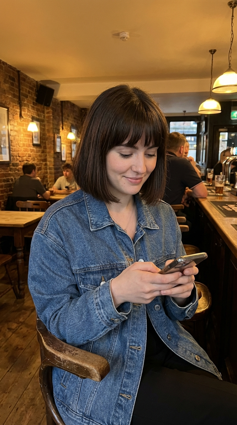 NANO BANANA PROИнтимный кадр в тёплом баре: молодая женщина держит телефон и улыбается. Атмосфера уютная и естественная, благодаря тёплому свету и кирпичной стене.