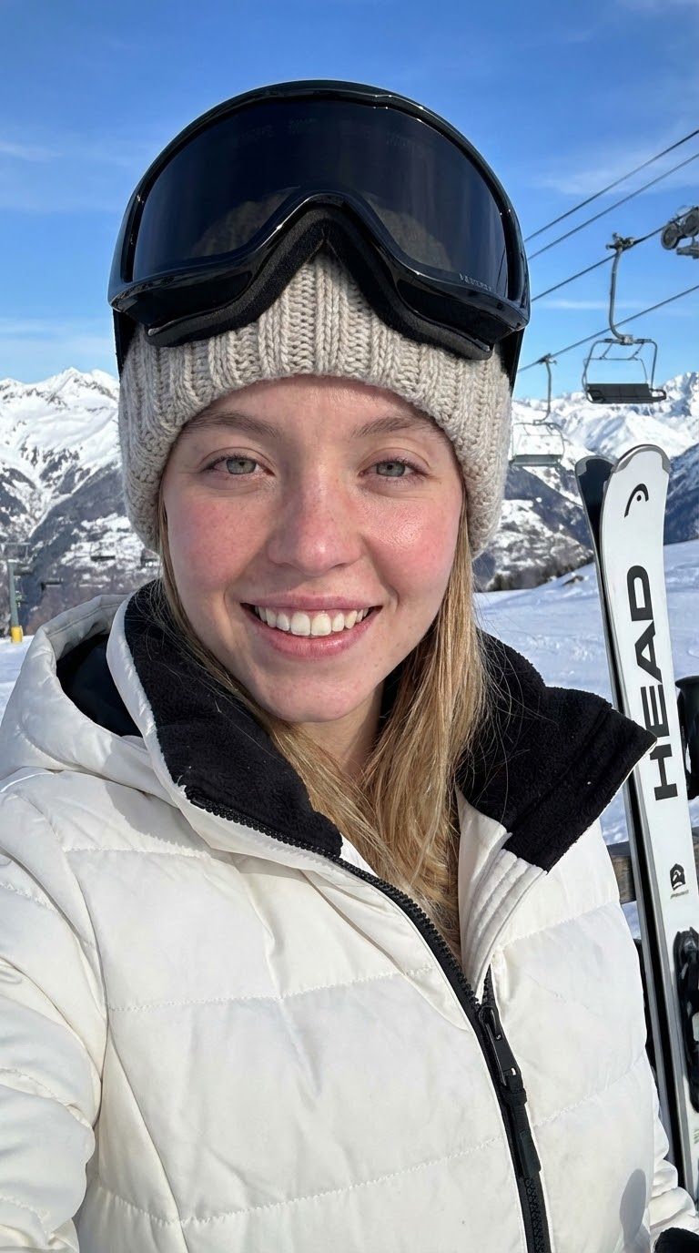 NANO BANANA PROДетальное селфи актрисы Sydney Sweeney на лыжном курорте в солнечный зимний день. Фото передает текстуру кожи, взгляд и яркий альпийский пейзаж.