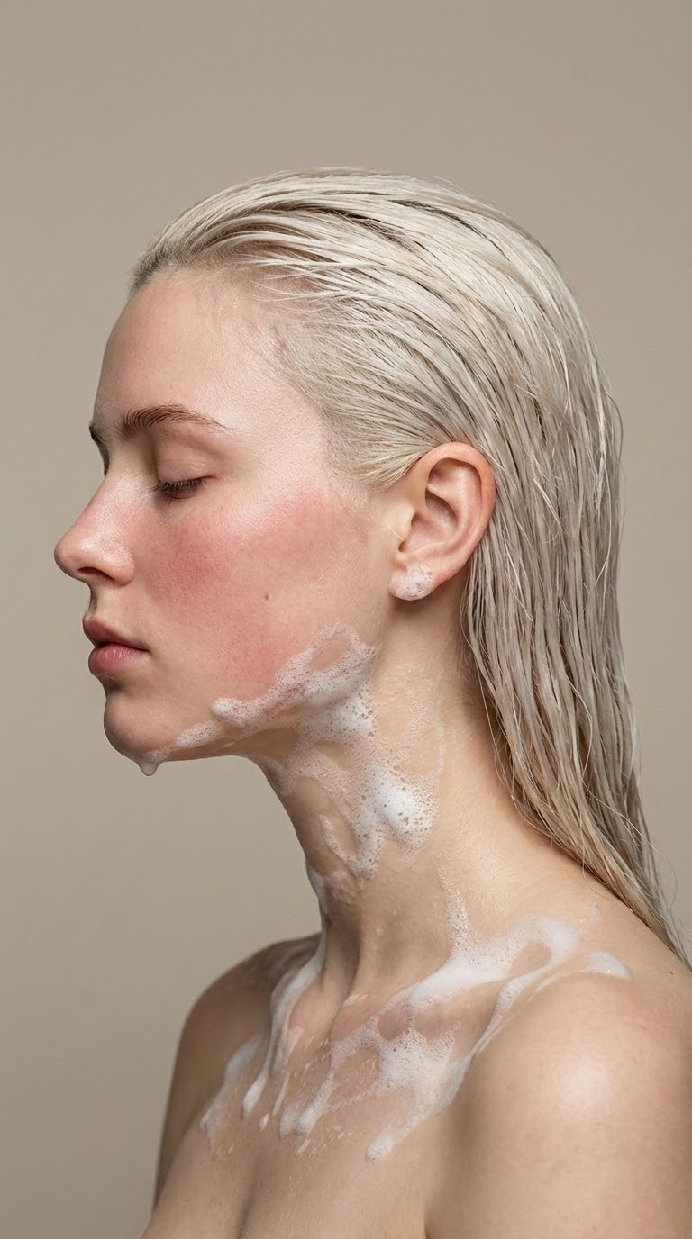 NANO BANANA PROПортрет молодой женщины в боковом профиле с мокрой кожей лица и мыльной пеной. Студийное освещение и минималистичный фон подчеркивают естественную красоту кожи, текстуру воды и эмоциональное спокойствие. Фокус на естественной коже.