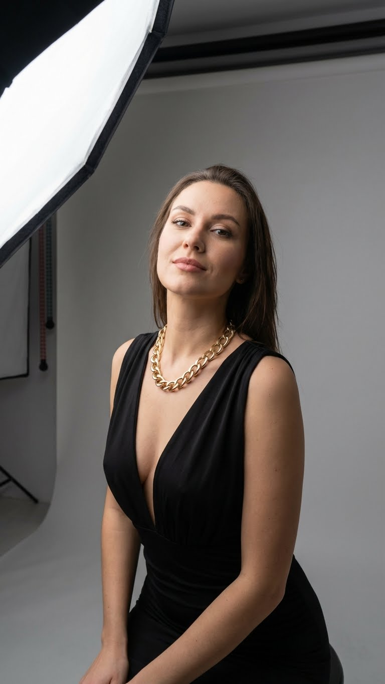 NANO BANANA PROПрофессиональная студийная фотосессия на черном фоне с женским портретом в элегантном стиле. Акцент на уверенную позу и минимальный свет для чистых контуров и выразительных деталей.