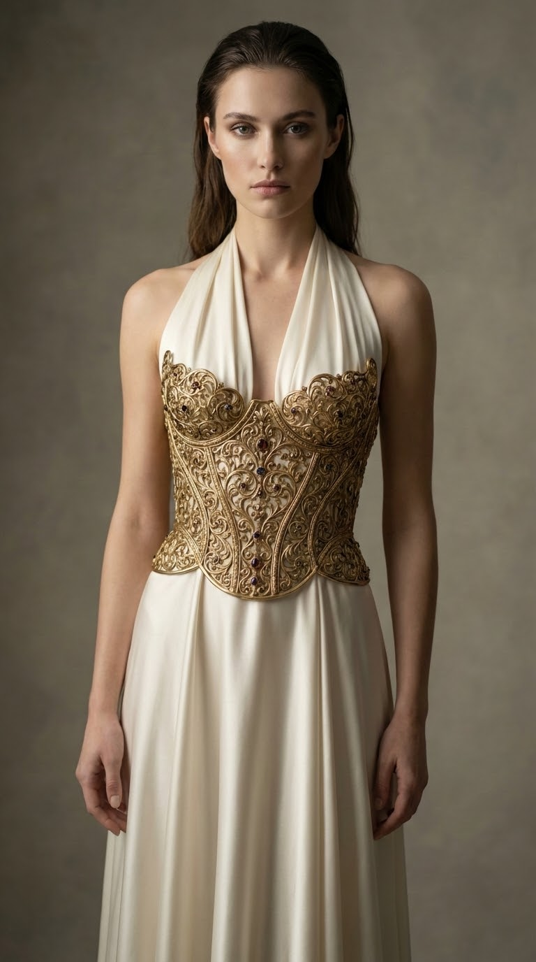 NANO BANANA PROПортрет в стиле high fashion с драпированным шелковым платьем и барокко декором. Акцент на студийное освещение и кинематографическую подачу моды.