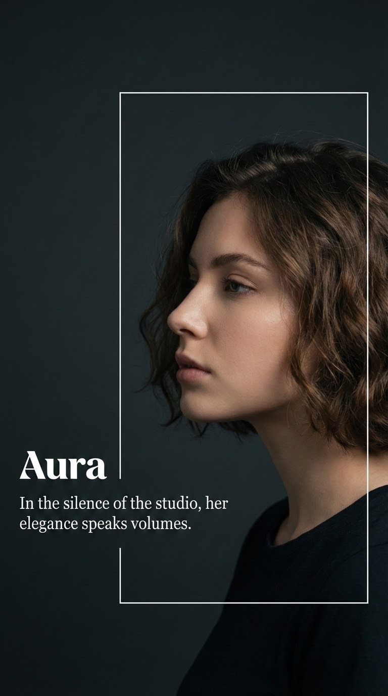 NANO BANANA PROСтильный фэшн портрет в студии. Боковой профиль модели на темном фоне с белой рамкой слева и легкой типографикой.