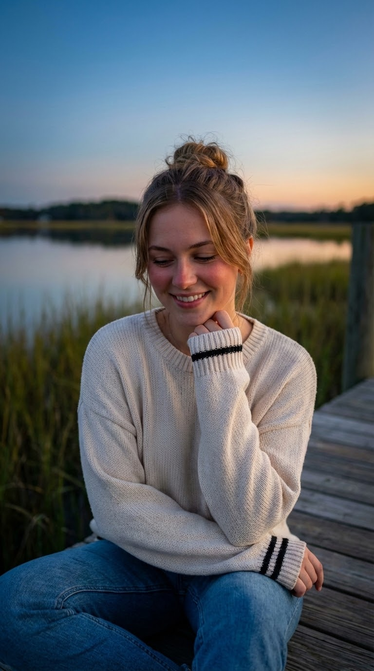 NANO BANANA PROПортрет молодой женщины в расслабленном лайфстайл-ракурсе на пирсе у вечернего озера. Мягкое естественное освещение и спокойная атмосфера создают дружелюбный образ.