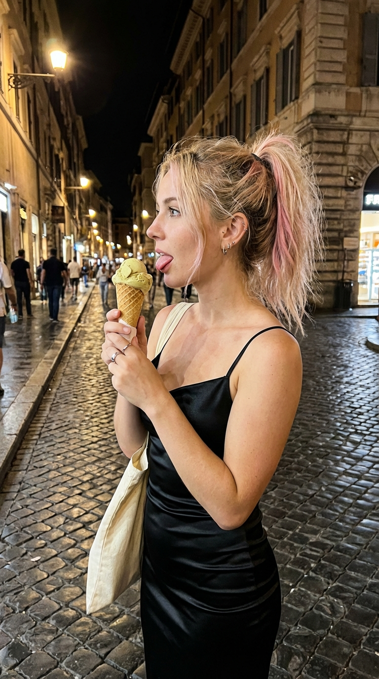 NANO BANANA PROУличный портрет молодой женщины в атласном платье на фоне ночной Европы. Съемка в candid-стиле с естественным светом и минимальной обработкой, подчёркивающая городские огни.