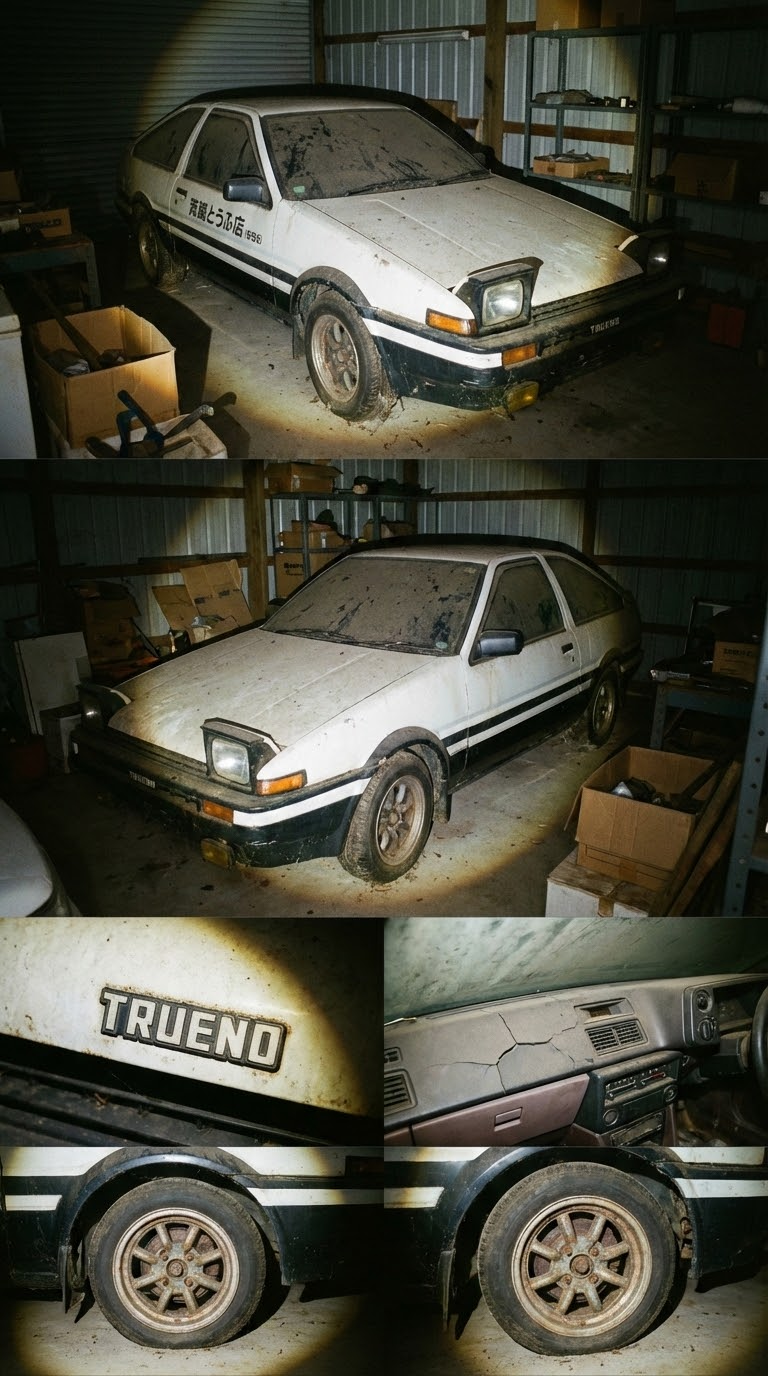 #AE86 в гараже#пыльный кузов#ночной гараж#крупный план AE86#ретро спорткар