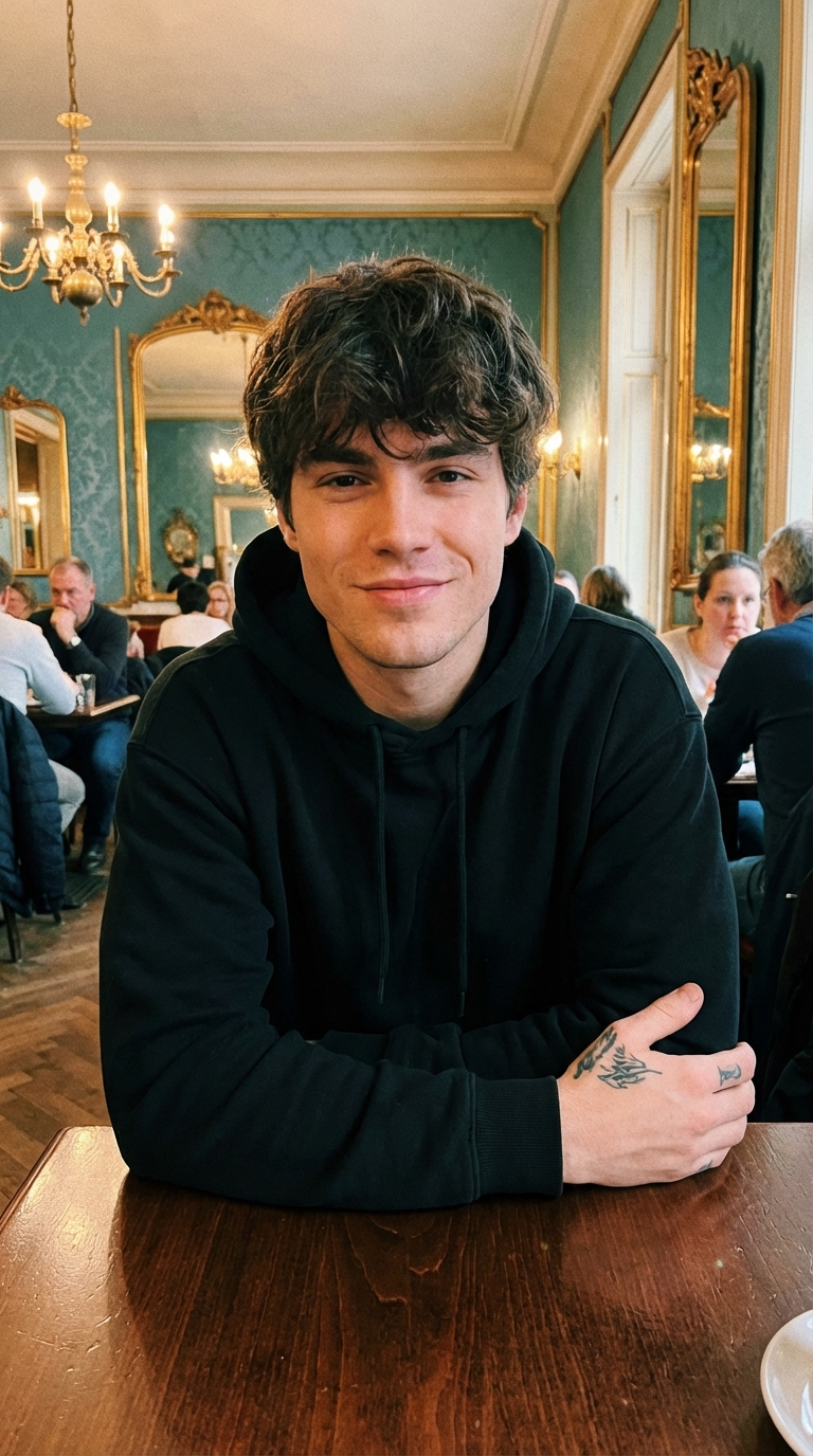 NANO BANANA PROПортрет молодого мужчины в черном худи за темным столом в барочном кафе. Уверенная поза и взгляд в камеру, теплый свет подчеркивают контуры лица.