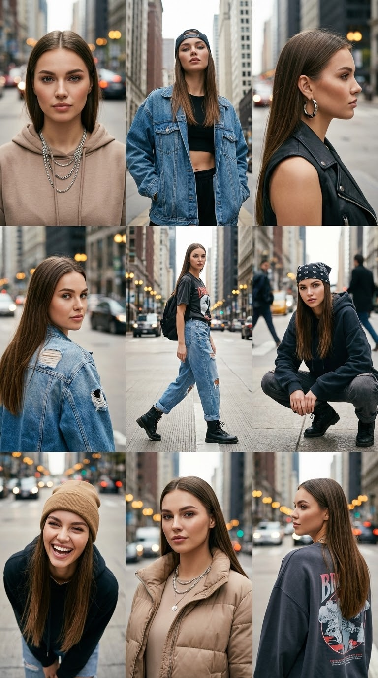 NANO BANANA PRO3x3 сетка портретов по референсу лица с единым стилем и городской атмосферой. Разные ракурсы и позы в урбанистической съемке, малая глубина резкости и естественное освещение.