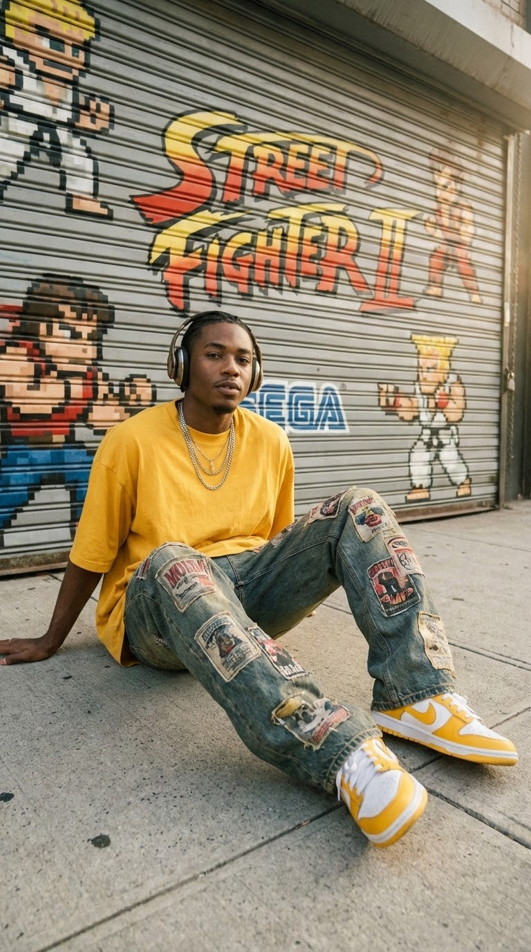 NANO BANANA PROСтильный молодой мужчина в городском уличном стиле сидит на бетонной тротуарной площади и излучает уверенность. Образ дополняют яркая футболка, цепи и винтажные наушники. Естественный свет подчёркивает текстуру кожи и детали ткани.