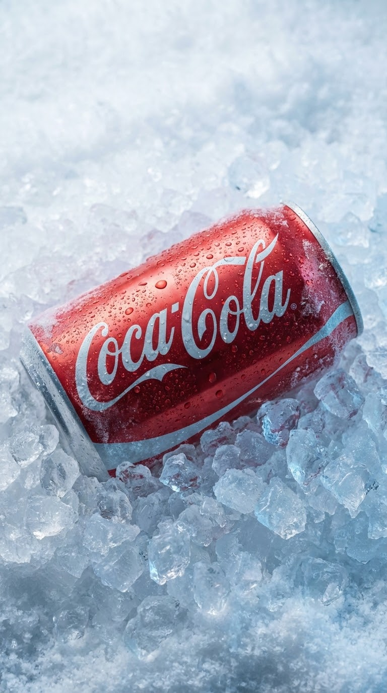 NANO BANANA PROВысокодетализированная студийная съемка Coca-Cola в горизонтальном положении, частично погруженной в лёд и снег. Освещение подчеркивает металлический блеск банки и холодную конденсацию.