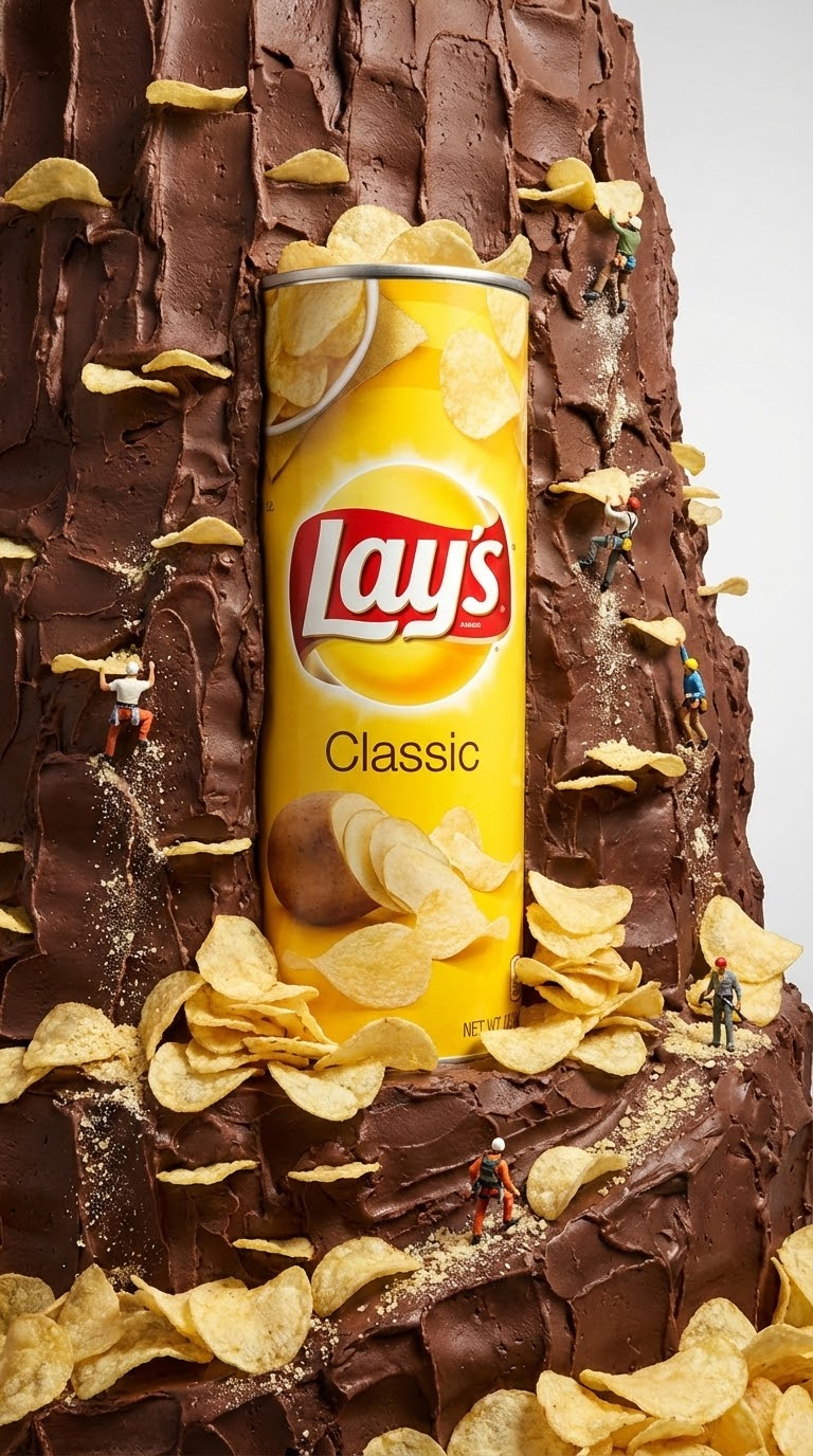 NANO BANANA PROСюрреалистичная миниатюрная сцена: банка Lay's на шоколадной скале, чипсы выступают зацепами. Детальная текстура и контраст создают премиальный рекламный образ.