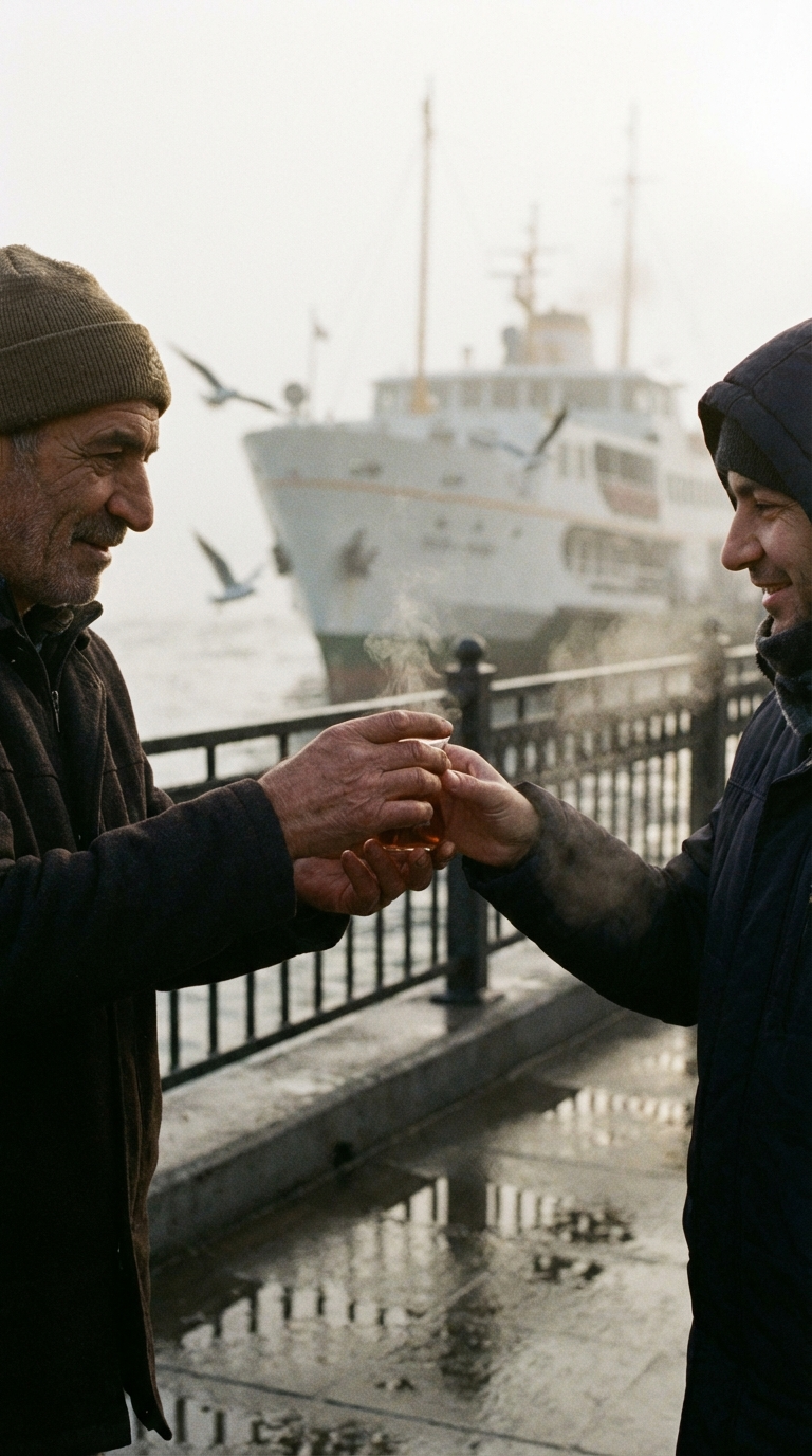 NANO BANANA PROДокументальная уличная сцена. Чайный продавец в кадре, капли на стекле и утренний туман над водой.