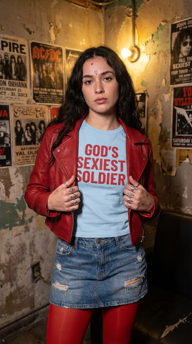 NANO BANANA PROФотосессия женщины в красных колготках и красной кожаной куртке в индустриальном интерьере. Образ дерзкий и стильный, подача кинематографическая.