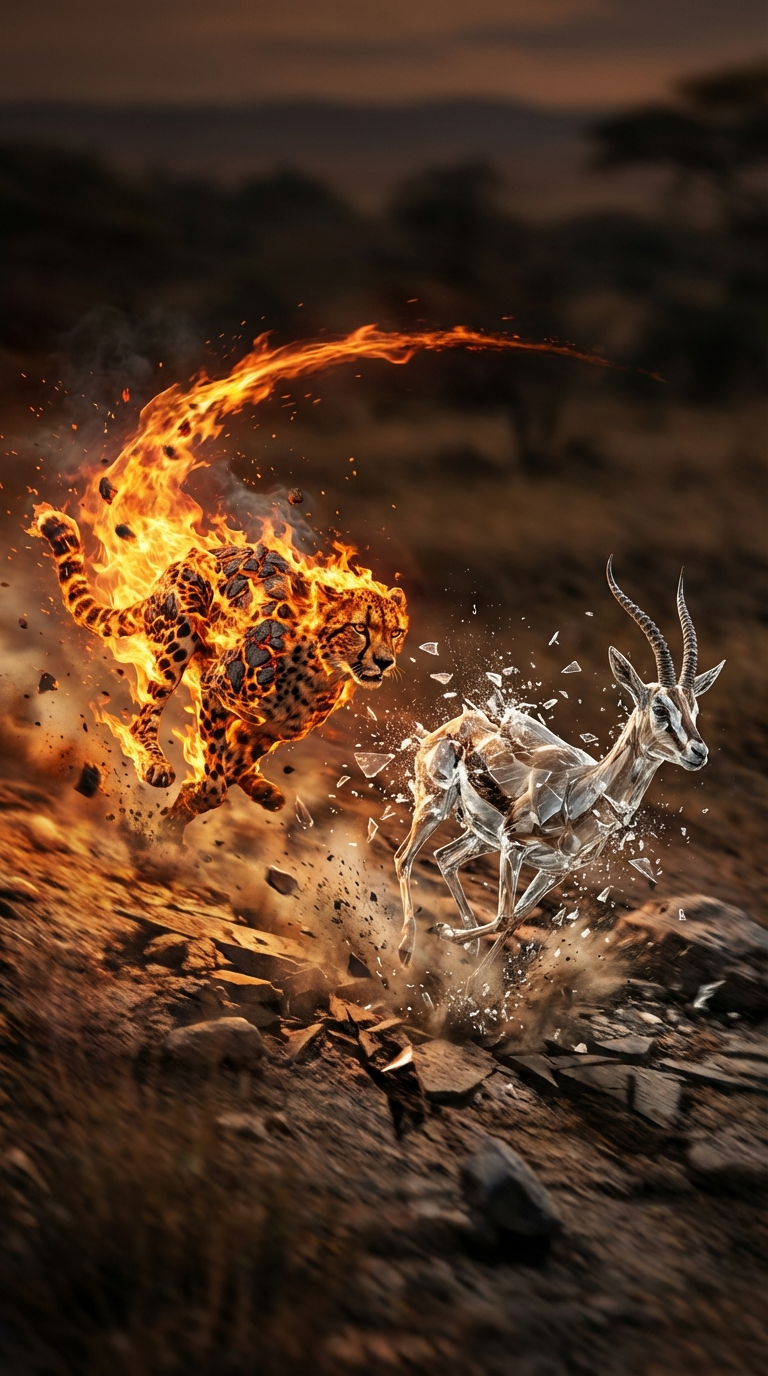NANO BANANA PROФотореалистичный кадр 8k: гепард в движении гонится за стеклянной целью, дым и искры. Разрушение стекла по траектории дуги под агрессивным освещением.