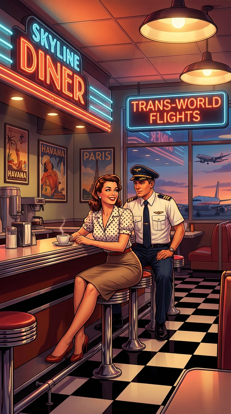 NANO BANANA PROПромпт в стиле ретро пин-ап, действие в аэропорт кафе с неоновыми вывесками и вечерним светом. Яркие цвета и высокий контраст дополняют освещение и эффект.